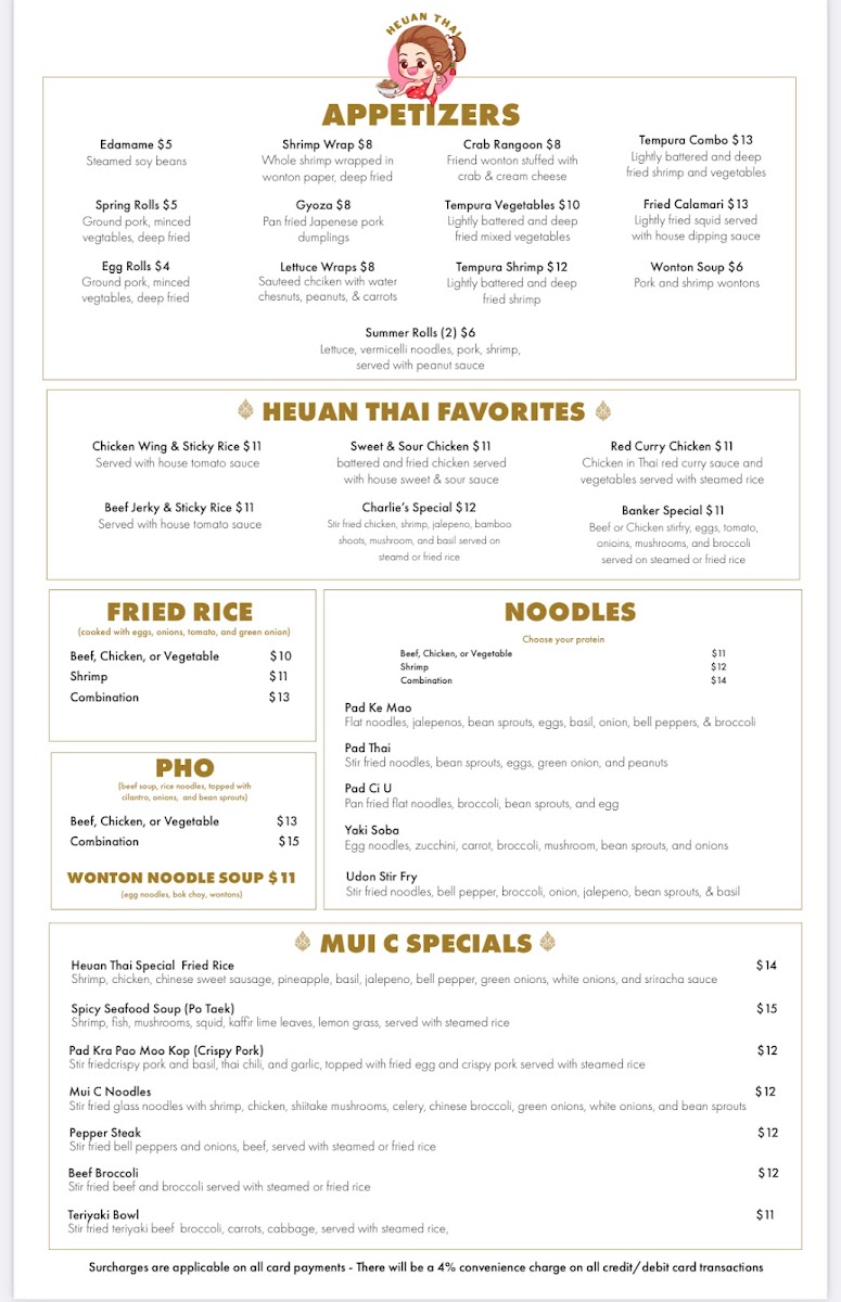 Heuan Thai Restaurant Menu is where bold flavors meet comforting classics. Tucked away at 149 N 25 Mile Ave in Hereford, this spot brings Thai cooking to life with dishes that feel homemade yet exciting. Start with warm appetizers like crispy spring rolls or spicy chicken wings, perfect if you want a little kick before diving into the mains. Then move into fragrant noodle plates or stir-fries layered with basil, lime, and chili, letting you taste that balance of sweet, salty, and spicy in every bite.